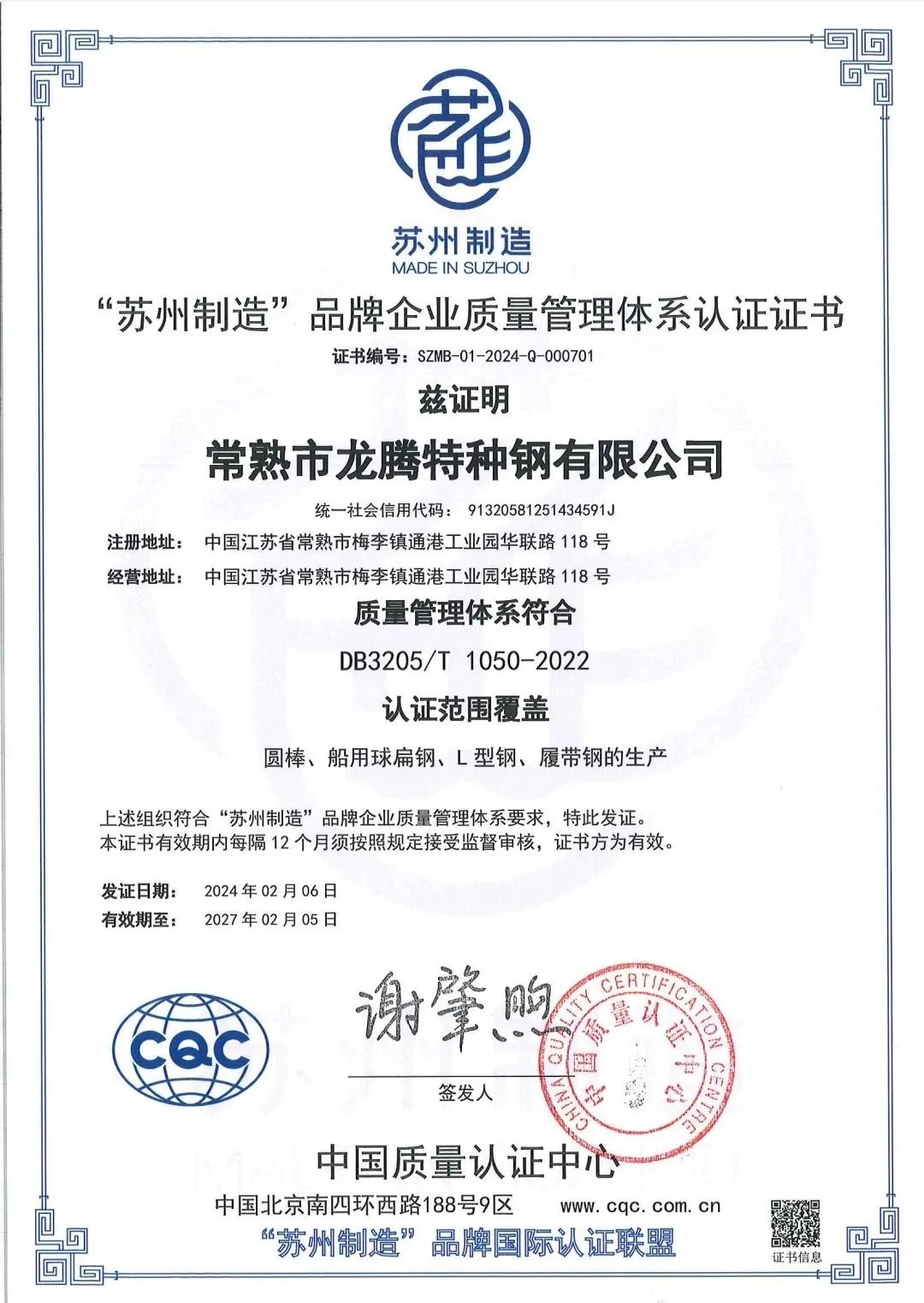 常熟市龍騰特種鋼有限公司首批通過“蘇州制造”品牌企業(yè)質(zhì)量管理體系認證