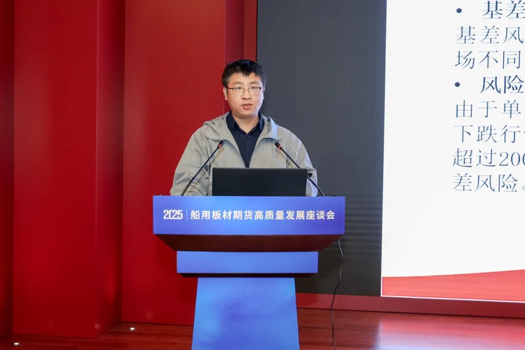 上海建發(fā)物資有限公司期現(xiàn)經(jīng)理鄭威以《船用鋼板鎖價套期保值交流》為題,介紹了船用鋼板鎖價業(yè)務(wù)及流程、并結(jié)合案例進行了分享。